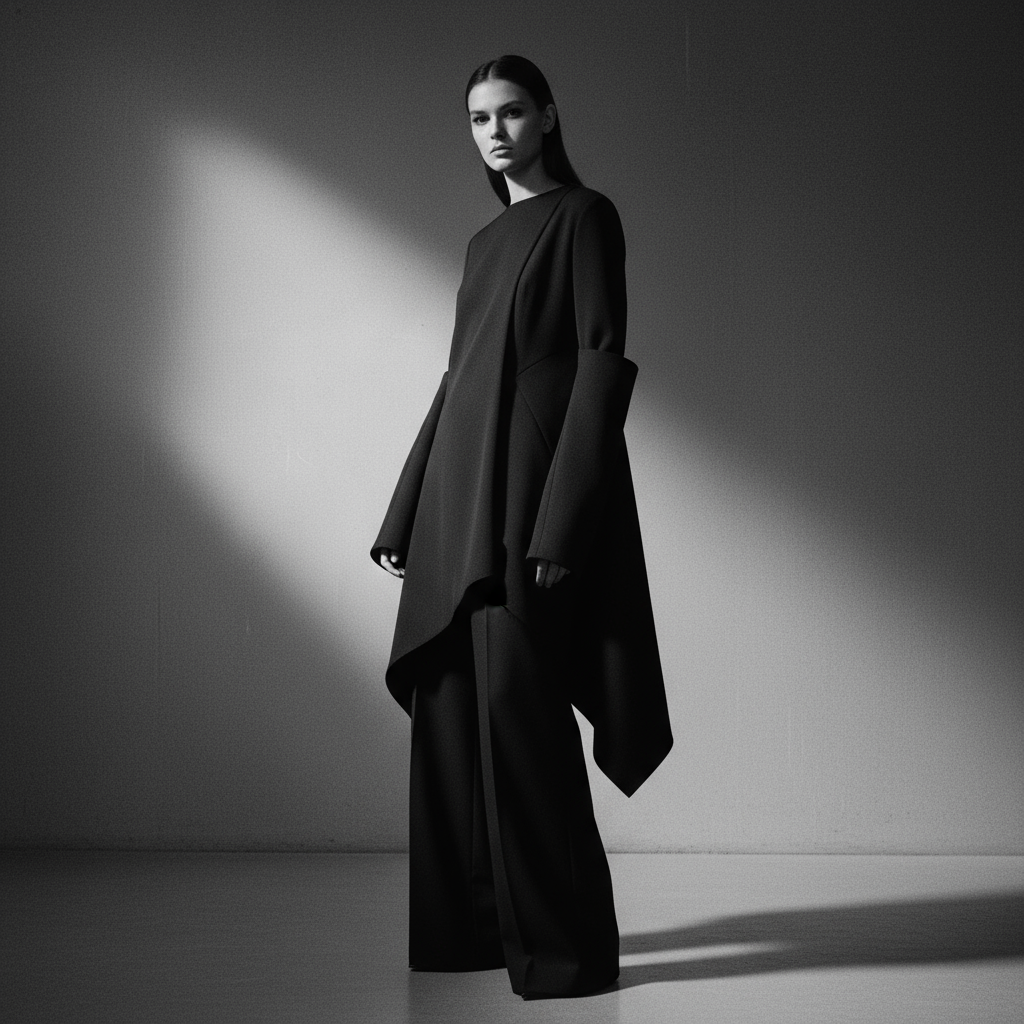 O processo envolveu um estudo detalhado sobre arquitetura brutalista, moda conceitual japonesa e fotografia monocromática, criando uma linguagem que une estrutura, textura e vazio.